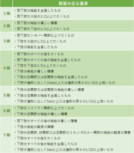 下肢障害の等級は、身体障害者福祉法に基づき1級から7級まで設定されており、数字が小さいほど重度です。等級は主に欠損障害、機能障害、変形障害の組み合わせによって決定されます。
